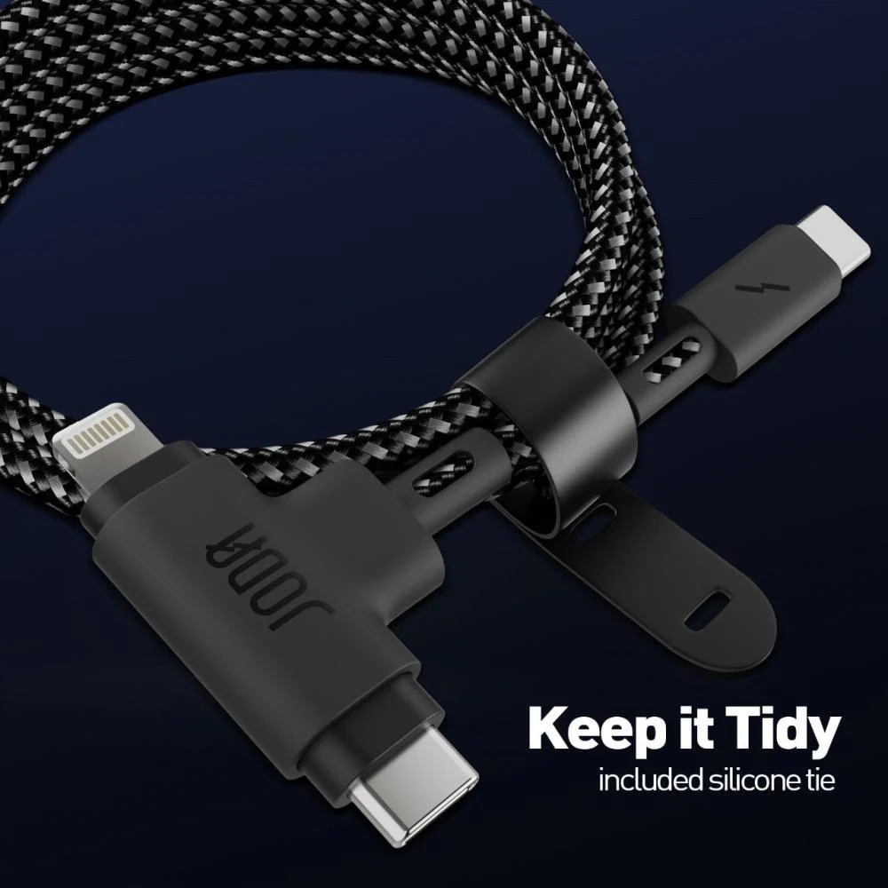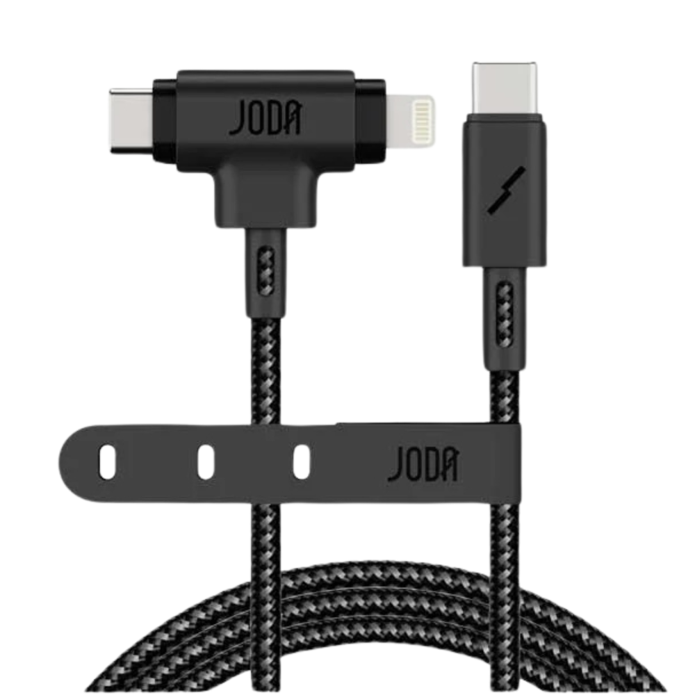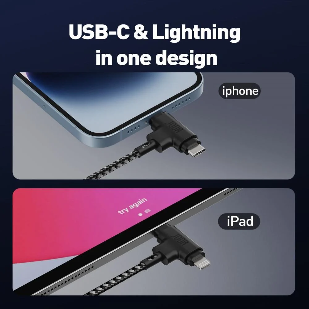 يأتي الكابل بمنافذ مزدوجة تدعم كلاً من USB-C وLightning في تصميم واحد مبتكر، مما يجعله مثاليًا لاستخدامه مع مجموعة واسعة من الأجهزة الذكية. سواء كنت تستخدم هواتف آيفون أو أجهزة أندرويد، فهو يوفر اتصالًا مرنًا وسلسًا.