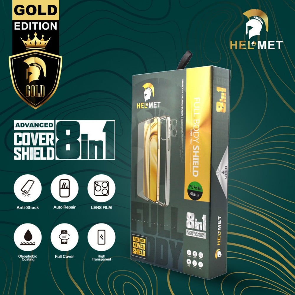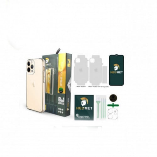 بكج حماية ايفون 11 برو ماكس - حماية HELMET الاصدار الذهبي: هو حلاً شاملاً لحماية هاتفك الايفون 11 برو ماكس . يتضمن هذا البكج حماية شاشة عالية المتانة بتقنية النانو، كفر خلفي من السليكون، تغليف حراري للحماية الإضافية، وحماية عدسة الكاميرا الخلفية. يتميز بتصميمه الأنيق والفريد، مما يضيف لمسة من الجمال والأناقة إلى جهازك. هذا البكج يوفر لك الحماية الشاملة والاطمئنان لاستخدام هاتفك الثمين.