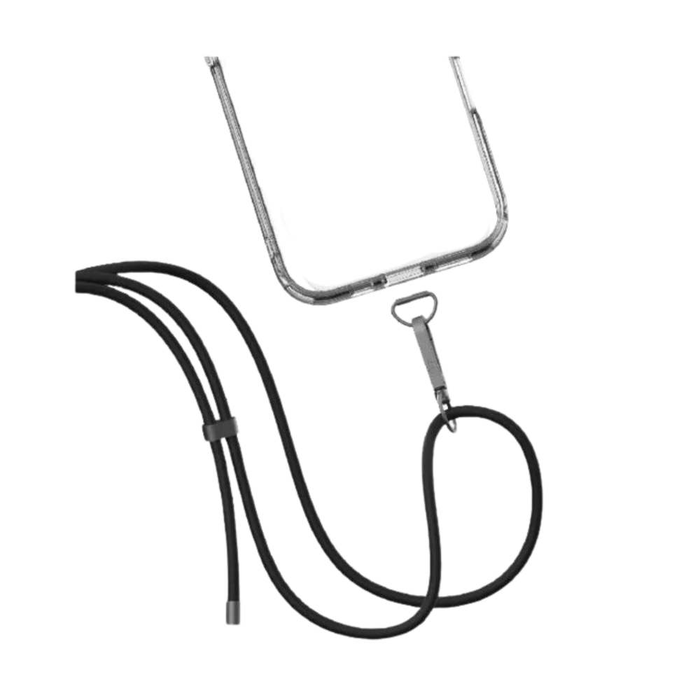 حزام عبور من السيليكون مع حلقات تثبيت للهاتف بلون أسود، مصمم لتوفير راحة وأمان أكبر عند حمل هاتفك. يسمح لك هذا الحزام بحمل هاتفك بسهولة حول عنقك أو كتفك مع إبقائه ثابتًا بفضل الحلقات الخاصة، مما يجعله مثاليًا للاستخدام اليومي أو السفر.